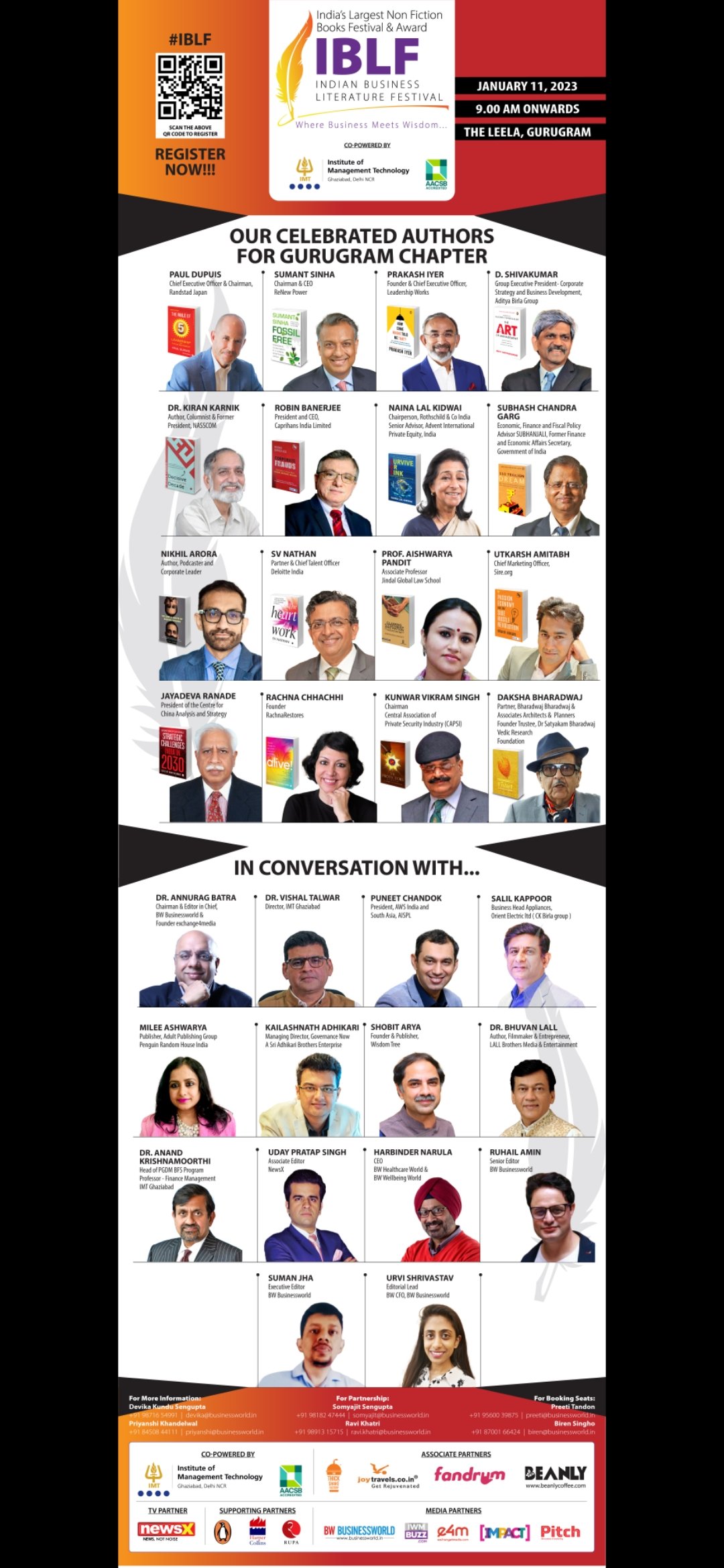 Business is an ever-evolving, multi-faceted arena. Everyone has a take on how businesses should be run, and what it takes to ‘make it’ in a competitive industry. It is one of the oldest topics ever written about, and while a lot of ground is already covered, there is still a lot more that can be said. This is why we have authors, speakers, and industry experts from all walks of life who have something to contribute to business and its various aspects. Recognising this fact, BW Businessworld Pvt Ltd is organising the Gurugram chapter of the ‘Indian Business Literature Festival’ (IBLF )on the 11th of January 2023, at the Leela, Gurugram. It is often obsserved that with growing seniority in a company, the time to read is becomes progressively scarce. The idea of IBLF is to re-instil the habit of reading in CXOs. Once the senior leadership develops the habit of constant reading and learning, it becomes easier for them to inspire young professionals in their company to follow suit. While we acknowledge reading is a habit one should develop, an even harder task is to write effectively. IBLF is a celebration of all those who are able to accomplish the difficult task of putting forth their thoughts in a lucid and effective manner. The star-studded event will witness the who’s who of top leadership across industries. IBLF recognises and appreciates the life and career experience of industry veterans, who should be celebrated as heroes in their own right. The event has a curated set of speakers who will be present to discuss their work. Some of them include: